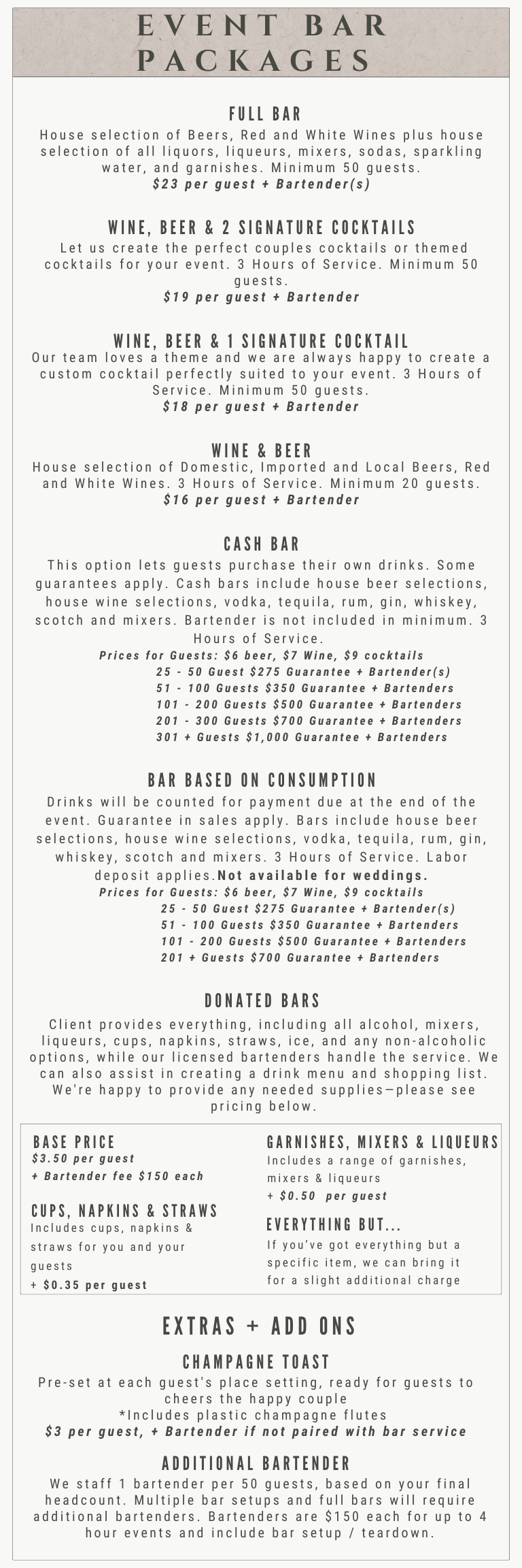 We’ll work with you to set up a cash bar at your event that brings the right alcoholic and non alcoholic beverages. All of our cash bars do have a minimum that we need to hit and we work with you to establish a fair minimum that should be hit by the patrons at the event. We rarely ever see bars not hit their minimums.